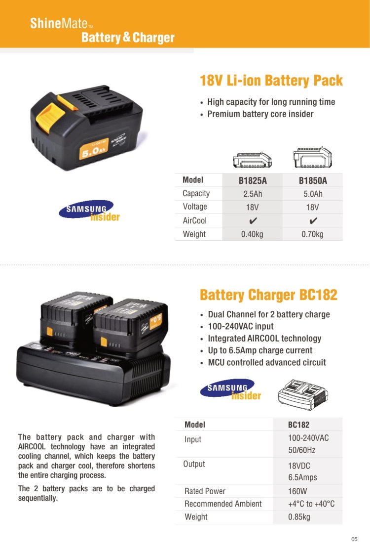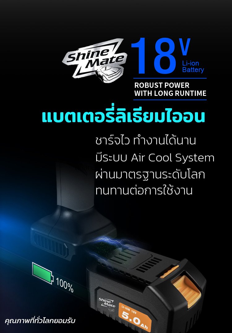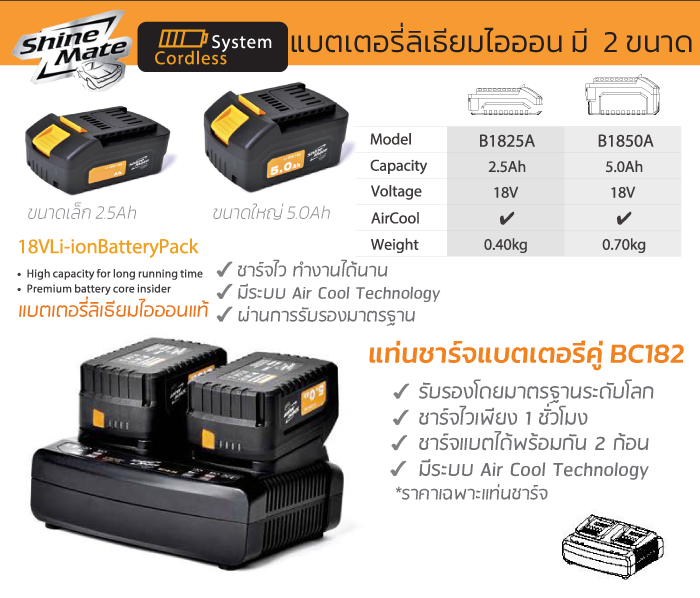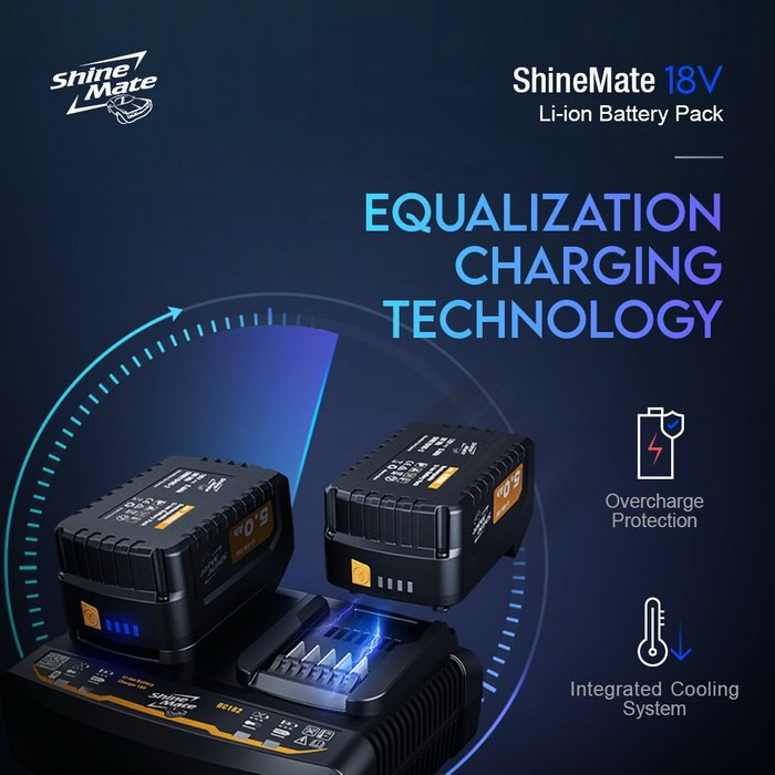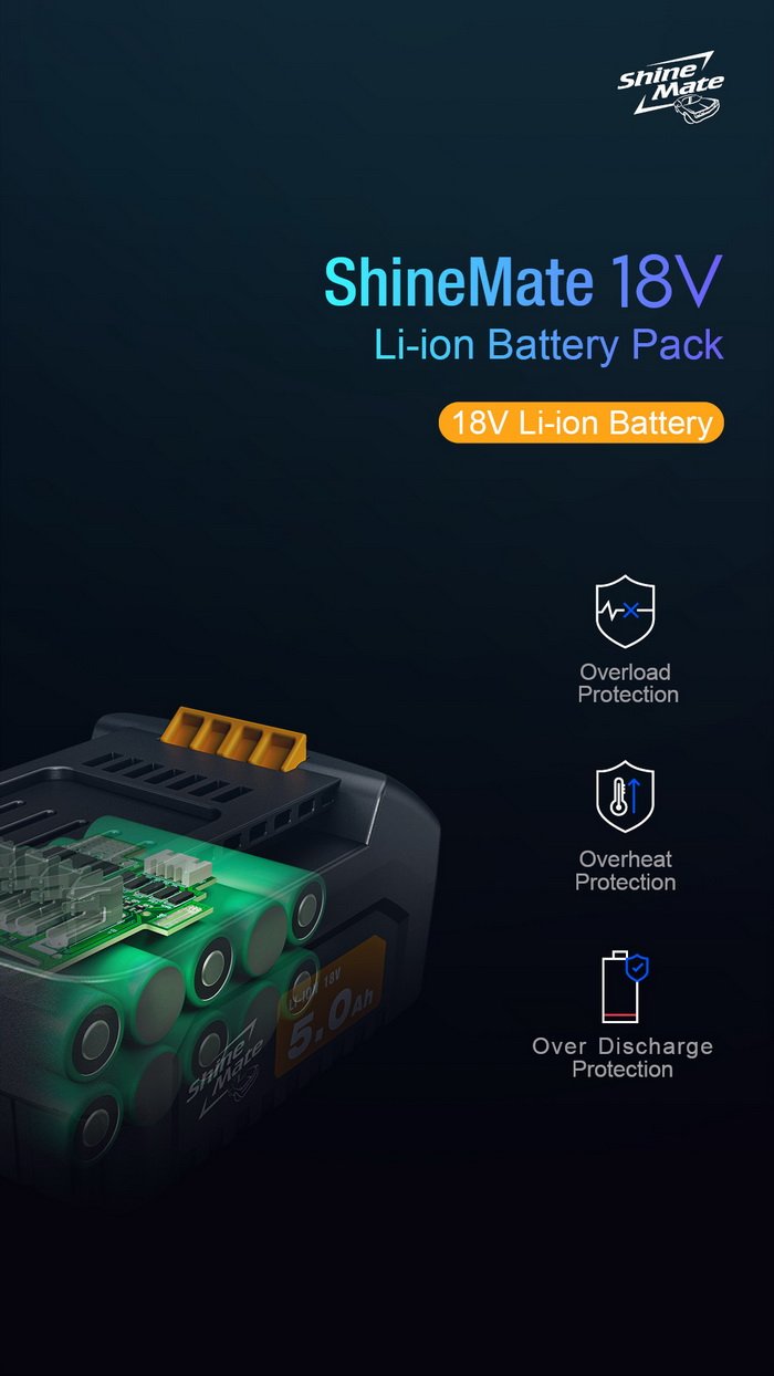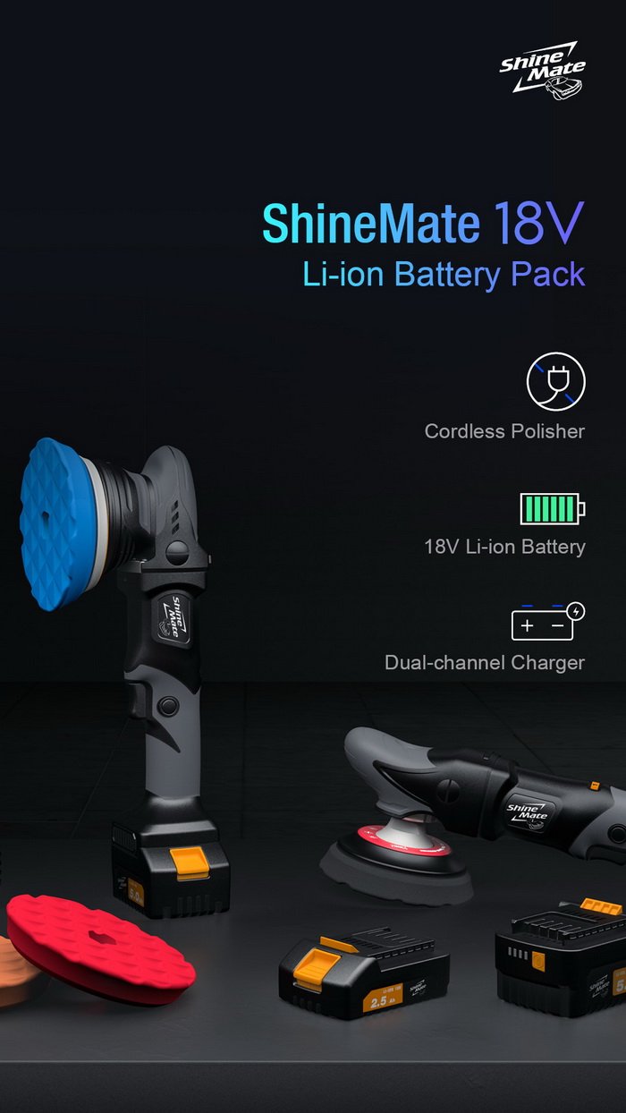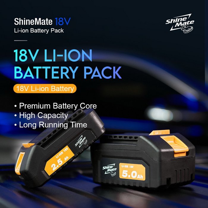 เทคโนโลยีแบตเตอรี่ลิเธียม 18v จาก Shine Mate ผ่านการรับรองความปลอดภัยมาตรฐานสากล ชาร์จไวเพียง 1 ชั่วโมง ใช้งานได้เป็นเวลานาน ผลิตจาก CORE Battery คุณภาพสูงทนทานต่อการใช้งาน มีความจุให้เลือก 2 ขนาด 2.5Ah และ 5.0Ah ใช้ได้กับเครื่องขัดสีรถไร้สายของ Shine Mate ได้ทุกรุ่น