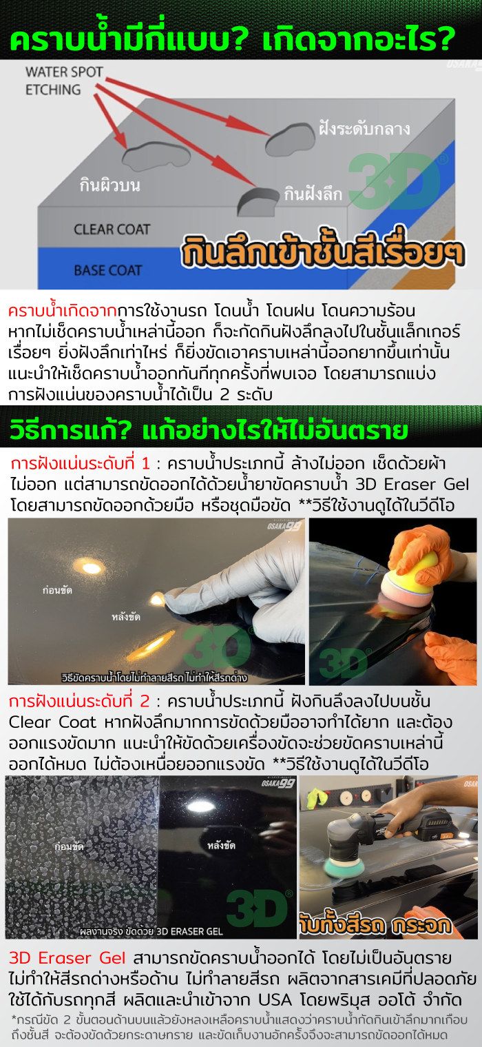 คราบน้ำติดรถ คราบน้ำฝังบนกระจกรถ ล้างไม่ออก คราบน้ำฝังแน่น มีวิธีแก้ไขง่ายๆ ด้วยน้ำยา 3D Eraser Gel นำเข้าจาก USA ไม่ทำให้สีรถด่าง ไม่เป็นอันตรายต่อสีรถ แนะนำว่าคราบน้ำฝนมีค่าความเป็กรด สามารถที่จะกัดกิน และฝังเป็นคราบบนสีรถหรือกระจกได้ เมื่อโดนความร้อน ดังนั้นเมื่อเจอคราบน้ำบนสีรถ แนะนำให้ขัดออกทันที อย่างไรก็ตามการเลือกใช้น้ำยามาขัดคราบน้ำต้องระวัง เพราะน้ำยาบางชนิดขัดคราบน้ำออก แต่อาจเป็นอันตรายต่อสีรถ ดังนั้นจึงควรเลือกน้ำยาที่ไม่เป็นอันตรายต่อสีรถ คราบน้ำมีการฝังแน่นหลายระดับ หากฝังแน่นกินลงไปในชั้นสีรถลึกแล้ว แนะนำให้ใช้กับเครื่องขัดสีรถจะช่วยให้ขัดได้ดียิ่งขึ้น น้ำยา 3D Eraser Gel ขวดใหญ่ 16oz (~500ml) สามารถใช้ได้ทั้งสีรถ กระจกรถยนต์ หลังคาแก้ว กระจกบ้าน กระจกห้องอาบน้ำ คราบน้ำในห้องน้ำ สามารถขัดเอาคราบน้ำออกได้โดยไม่เป็นอันตรายต่อพื้นผิววัสดุ