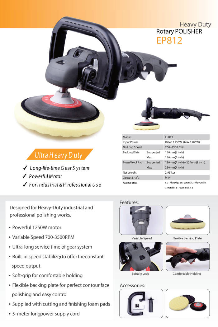 แนะนำเครื่องขัดสีรถ Shine Mate EP812 Heavy Duty มอเตอร์ 1250w รองรับงานหนัก งานอู่ซ่อมสีตัวถัง ทนทานทุกการใช้งาน ทรงพลังที่สุดตั้งแต่เคยมีมา ทำงานได้ไวที่สุด ตัวเครื่องน้ำหนักเบากว่าเครื่องขัดแบบ heavy duty ทั่วไป ที่สุดของความแกร่ง และทรงพลังต้อง Shine Mate รุ่น EP812