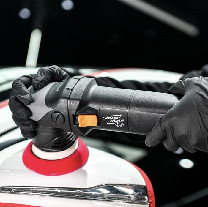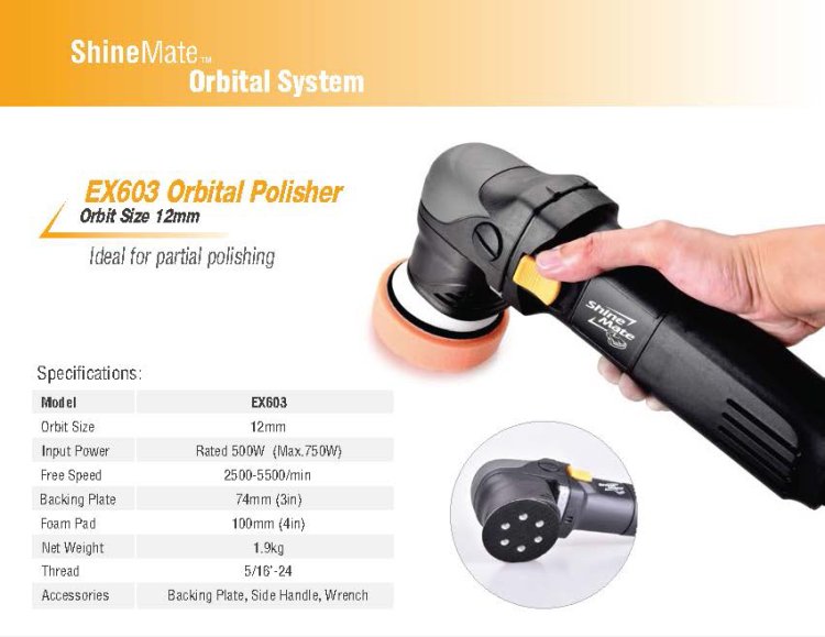 เครื่องขัดสีรถยนต์ SHINE MATE ระบบข้อเหวี่ยง Dual Action (DA) รุ่น EX603 มาพร้อมเทคโนโลยีใหม่ล่าสุด Anti-Shake ด้วยลูกตุ้ม CNC Componet ที่เป็นวัสดุเกรดพรีเมี่ยม ให้จุดศูนย์ถ่วงที่แม่งยำที่ 12 มม. ให้การทำงานที่นุ่มนวล ลดแรงสั่นสะท้าน ป้องกันการสะบัดขณะขัด ส่งกำลังขัดต่อเนื่องแม้มีแรงกดหรือกระแทก ตัวเครื่องขัดน้ำหนักเบา ได้รับความนิยมมากในอู่สีรถรวมถึงคาร์แคร์ชั้นนำทั่วโลก อย่าเชื่อจนกว่าจะได้สัมผัส สามารถเข้ามาทดลองสินค้าได้ที่บริษัท