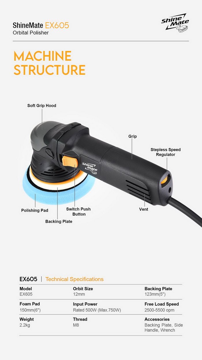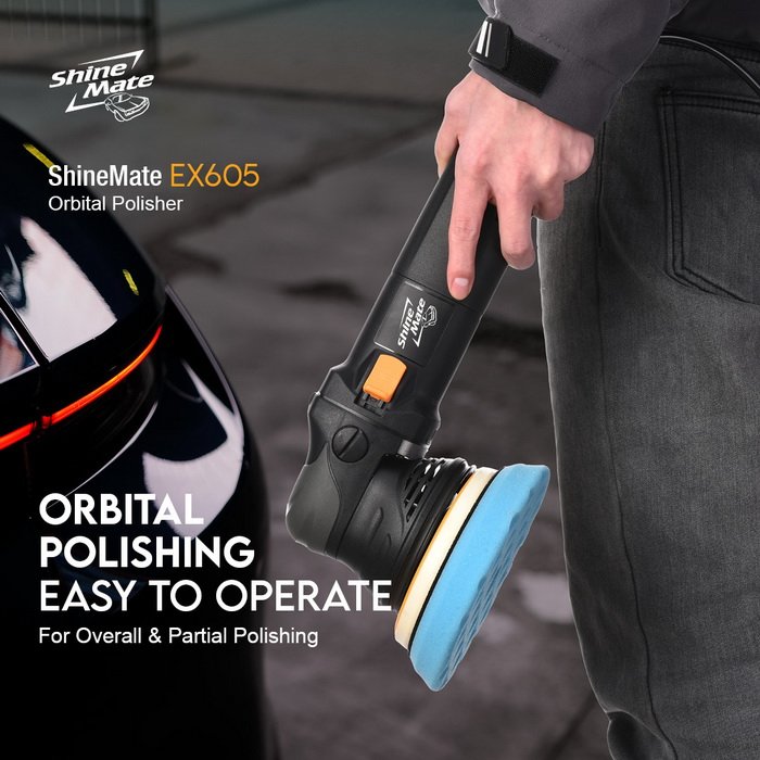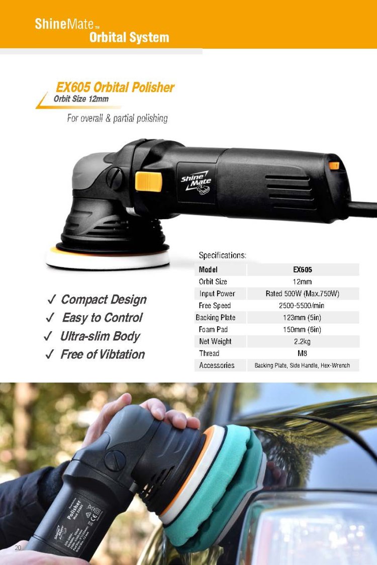 เครื่องขัดสีรถ Shine Mate รุ่น EX605 อีกหนึ่งรุ่นที่ได้รับความนิยมทั่วโลก ทั้งในยุโรป และสหรัฐอเมริกา ตัวเครื่องเป็นระบบ DA (Dual Action) หรือข้อเหวี่ยง ที่มีการใส่เทคโนโลยีลูกตุ้ม CNC Component ที่เป็นเอกสิทธิ์เฉพาะ Shine Mate ทำให้เครื่องมีความนุ่มนวลในการทำงาน นวัตกรรมมอเตอร์รุ่นใหม่ทนทานต่อการใช้งานหนัก ระบบเฟืองที่มีความทนทานเพิ่มมากขึ้น มาพร้อมแป้นขัดรุ่นใหม่ Dust Devil V.3 ที่มีรูระบายความร้อนขณะขัด รับประกัน 1 ปีเต็ม ทำให้รุ่นนี้ขายดีทั้งในประเทศไทยรวมถึงทั่วโลก